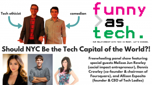 Find out more »Funny as Tech: Should NYC Be the Tech Capital of the World?! Special guests Dennis Crowley, Melissa Jun Rowley, & Allison Esposito!