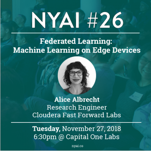 Find out more »NYAI #26: Federated Learning: Machine Learning on Edge Devices w/ Alice Albrecht (Research Engineer, Cloudera)