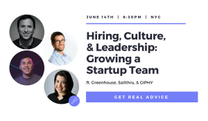 As you grow your company from 3 employees, to 10, to 30, to 100+, how does your hiring strategy change? What about your culture? And how do you manage and lead your growing team? Join us as we discuss these questions and more with Daniel Chait (Co-founder & CEO of Greenhouse), Neil Capel (Founder & Chairman of Sailthru), and Nam Nguyen (General Manager at GIPHY)!