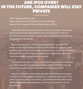 When: Wednesday, May 3rd, 2017 Where: Rise New York, 43 W 23rd Street, New York, NY 10010 Agenda: Check-in begins at 6:00 pm, Speakers begin at 7:00 pm Going public used to be the ultimate measure of success for private companies, but that's no longer the case. 2016 marked the third consecutive decline in IPOs - the lowest level since the last recession - and the number of publicly listed companies is at the lowest level in over 40 years.…